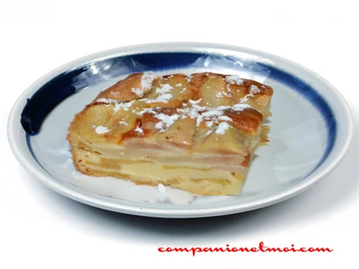 • Épluchez les pommes et les poires, enlevez les pépins et coupez-les en lamelles. Mettez les pommes dans le moule et répartissez la moitié de la pâte par-dessus. Etalez les poires par-dessus et versez le restant de pâte.