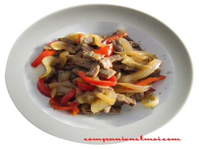 • Coupez la viande en lanières, déshumidifiez les lanières avec du papier absorbant et mettez-les dans un bol. Ajoutez la sauce teriyaki, salez et poivrez puis mélangez. Laissez mariner pendant 15 minutes.• Dans le bol du robot muni du Mélangeur, mettez les oignons et les poivrons coupés en julienne et l’huile puis démarrez le Programme Mijoté P1 pour 10 minutes.